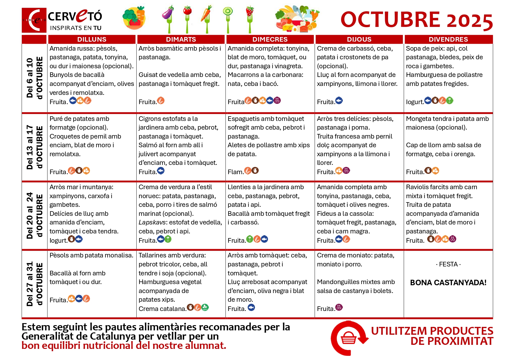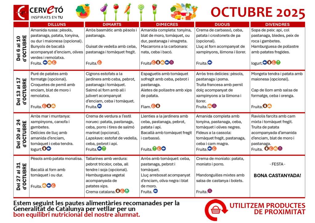 L’Escola disposa d’una cuina pròpia, amb menús variats i pensats dietèticament. A més, ofereix la possibilitat de menús adaptats a les necessitats de salut de l’alumnat, incloent-hi al·lèrgies, intoleràncies i altres requeriments específics. Aquest servei el considerem integrat dins el projecte pedagògic de l’escola i és per això que, amb la col·laboració dels/les monitors/es, treballem uns objectius bàsics que fan referència als hàbits alimentaris i a les actituds i responsabilitats que hem de mantenir dins aquest espai: recollir els seus serveis, gots, gerres d’aigua, safates, mantenir net l’espai de dinar…